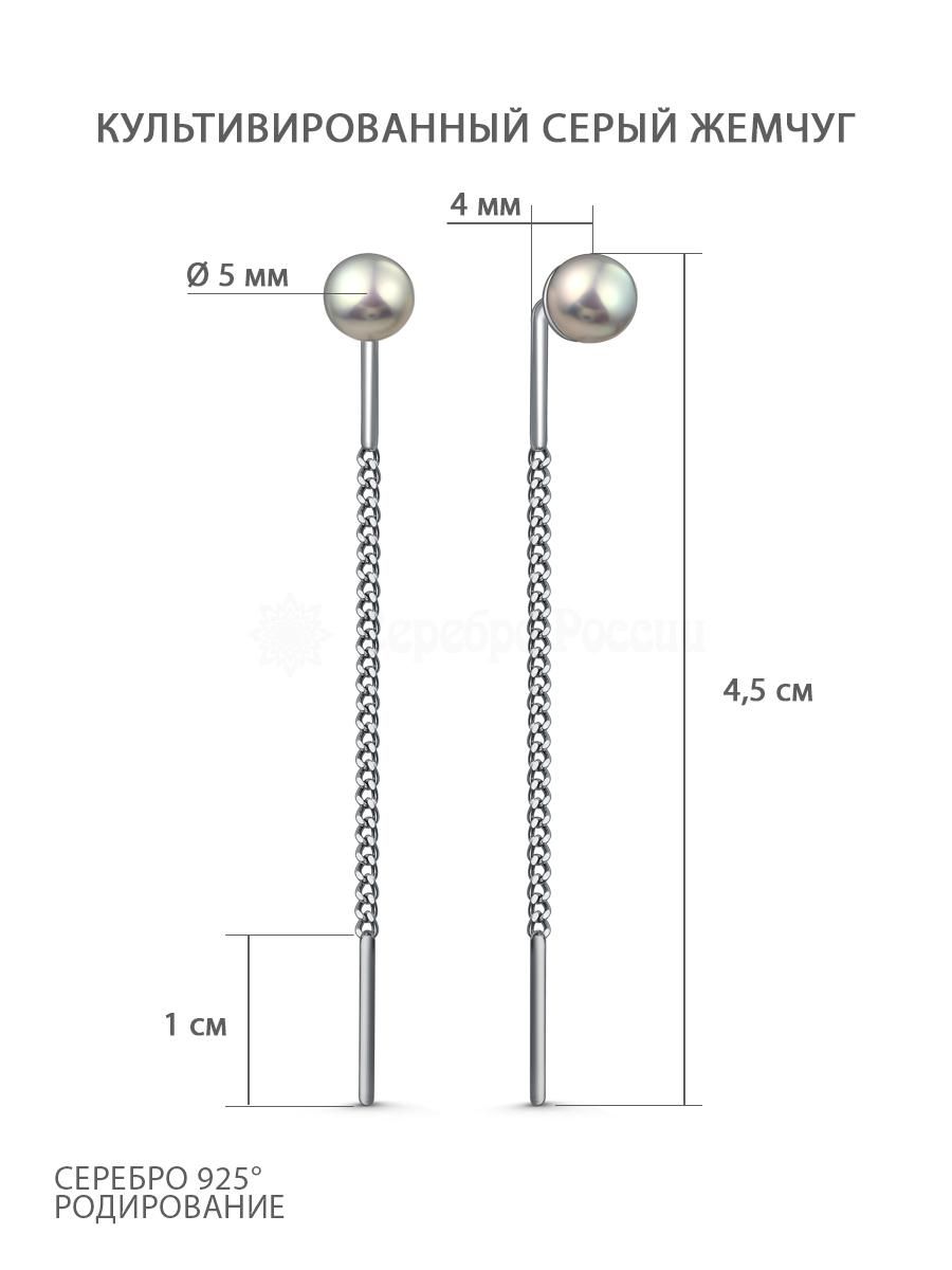 Серьги-продёвки из серебра с культивированным серым жемчугом родированные