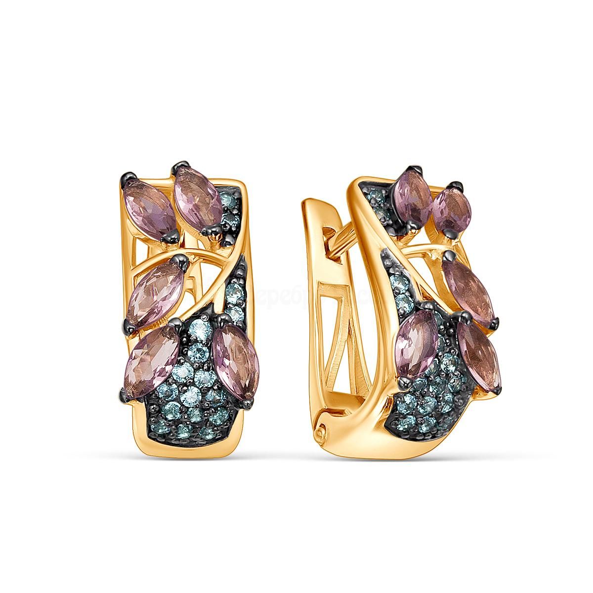 Серьги из золочёного серебра с пл. кварцем цв. родолит и фианитами цв. парайба 925 пробы 2-3151з110214