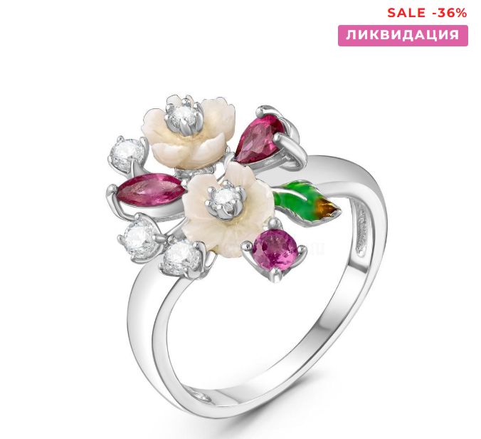 Кольцо из серебра с перламутром, нат.родолитом, кб.цирконием и эмалью родированное 925 пробы RR170929