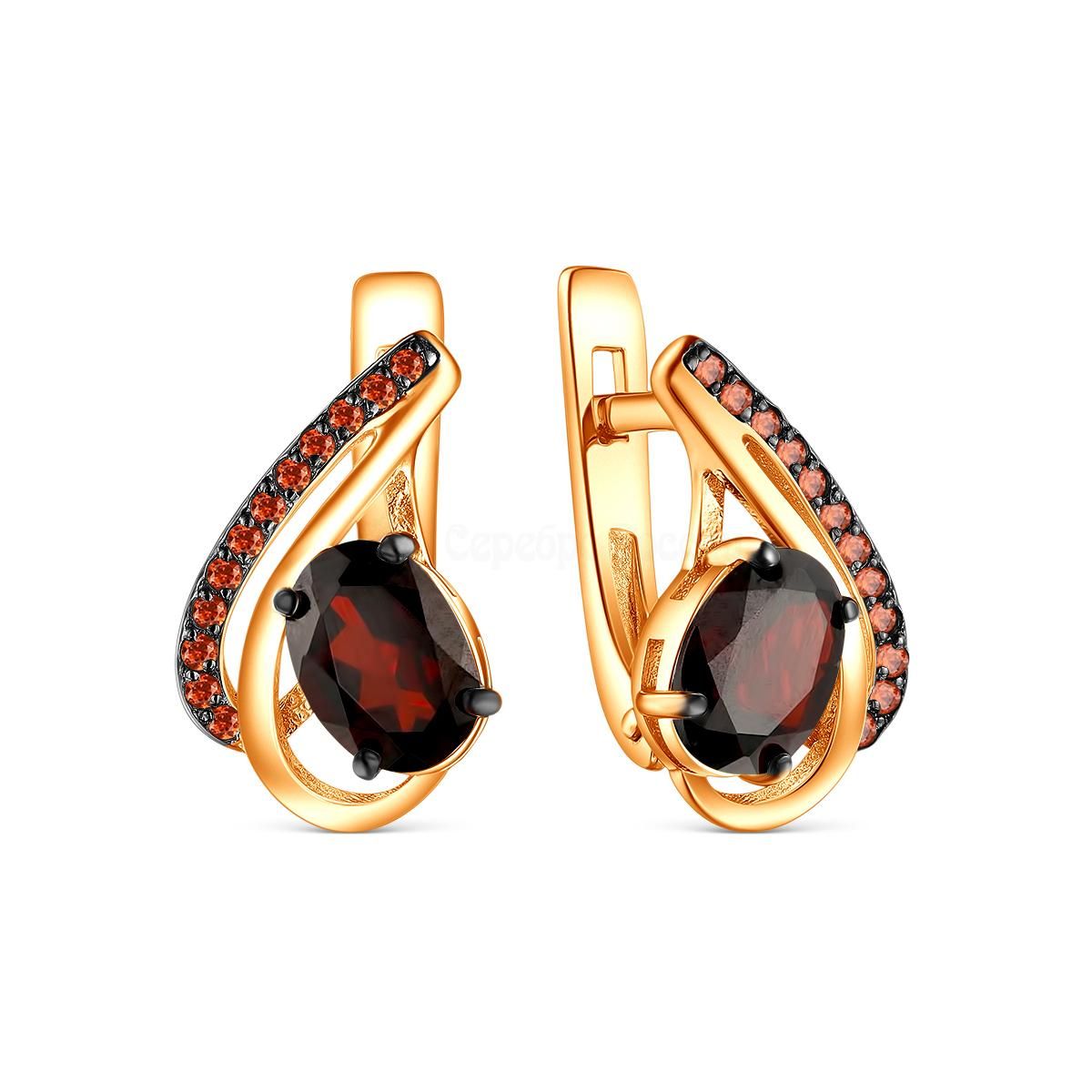 Серьги из золочёного серебра с натуральным гранатом и фианитами 925 пробы 02-1425з404204
