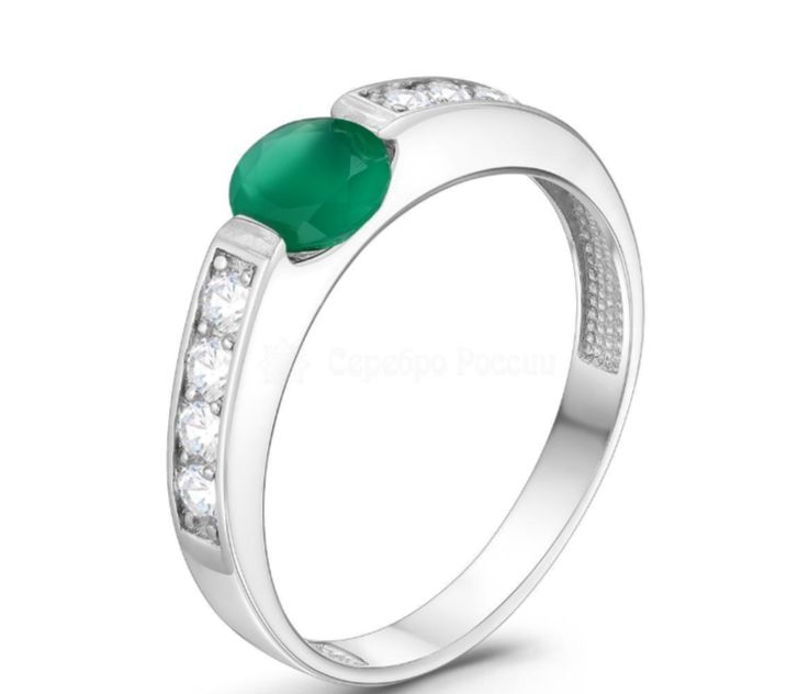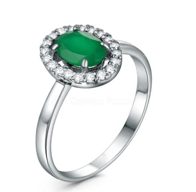 Кольцо из серебра с зелёным агатом и фианитами родированное 10156р459