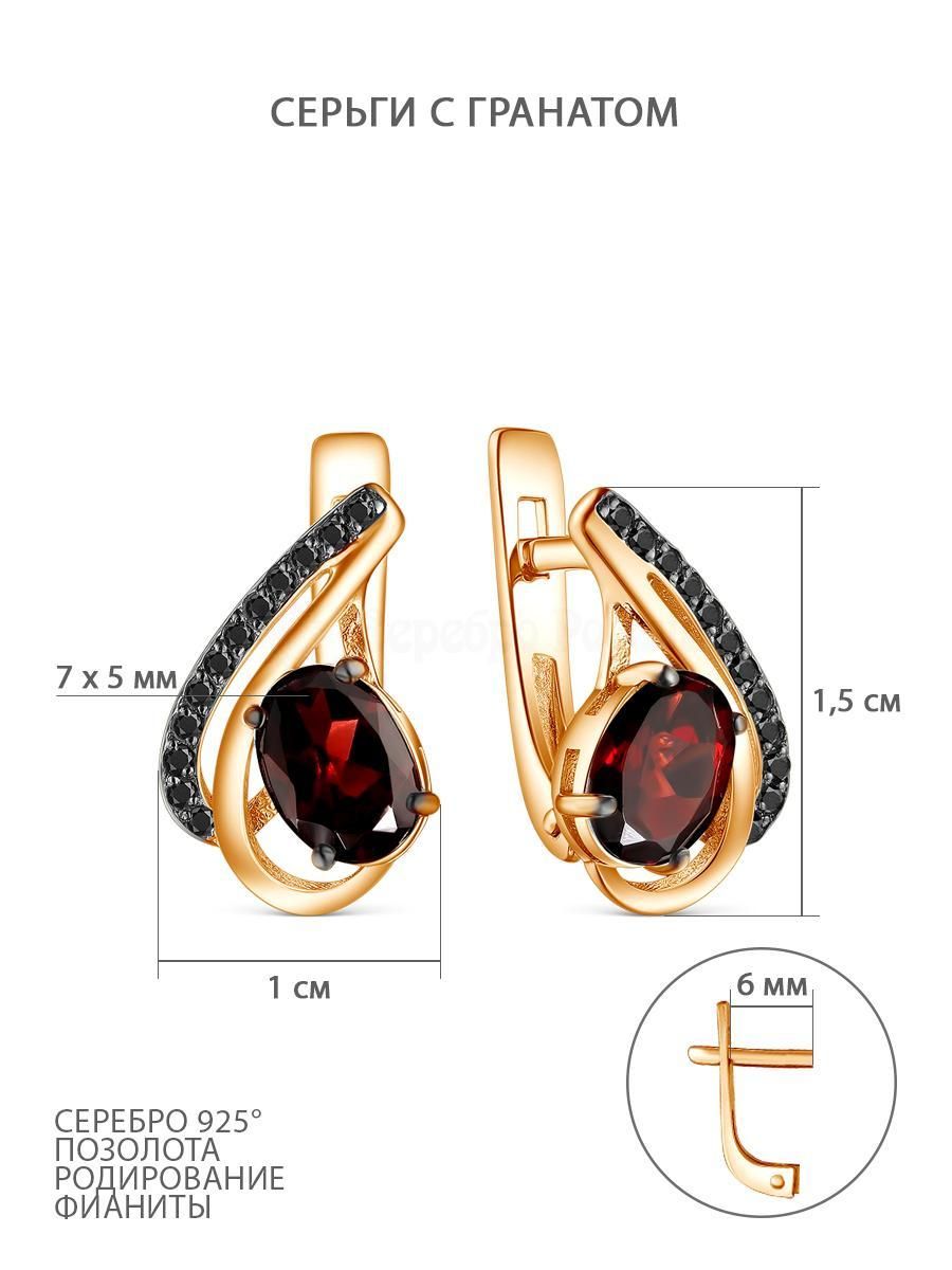Серьги из золочёного серебра с натуральным гранатом, фианитами и родированием 925 пробы 2-436зч404216