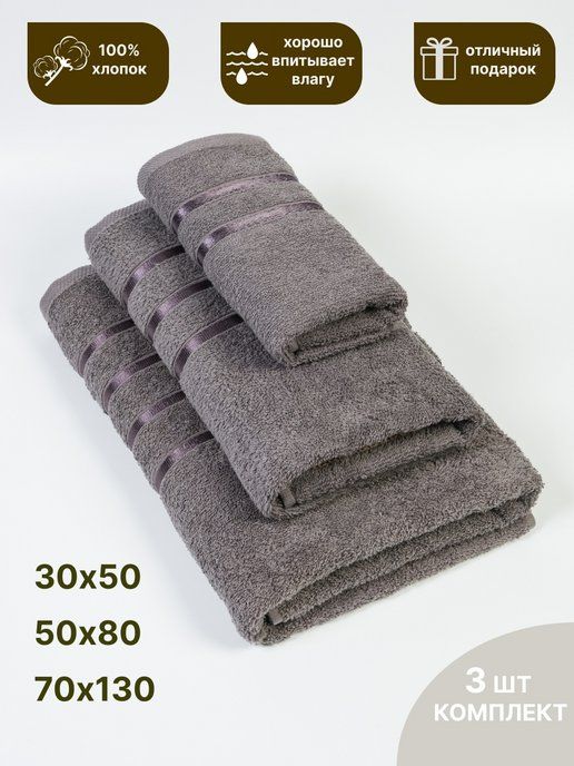 Набор махровых полотенец,3 шт(30х50, 50х80, 70х130) серый*
