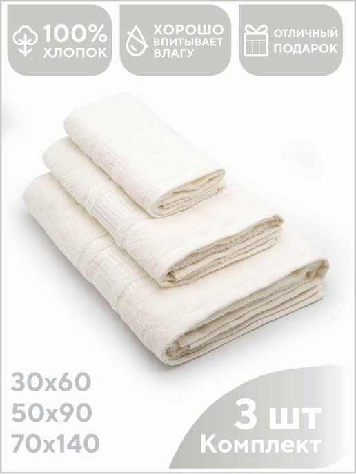 Набор махровых полотенец,3 шт(30х50, 50х80, 70х130) молочный/кремовый*